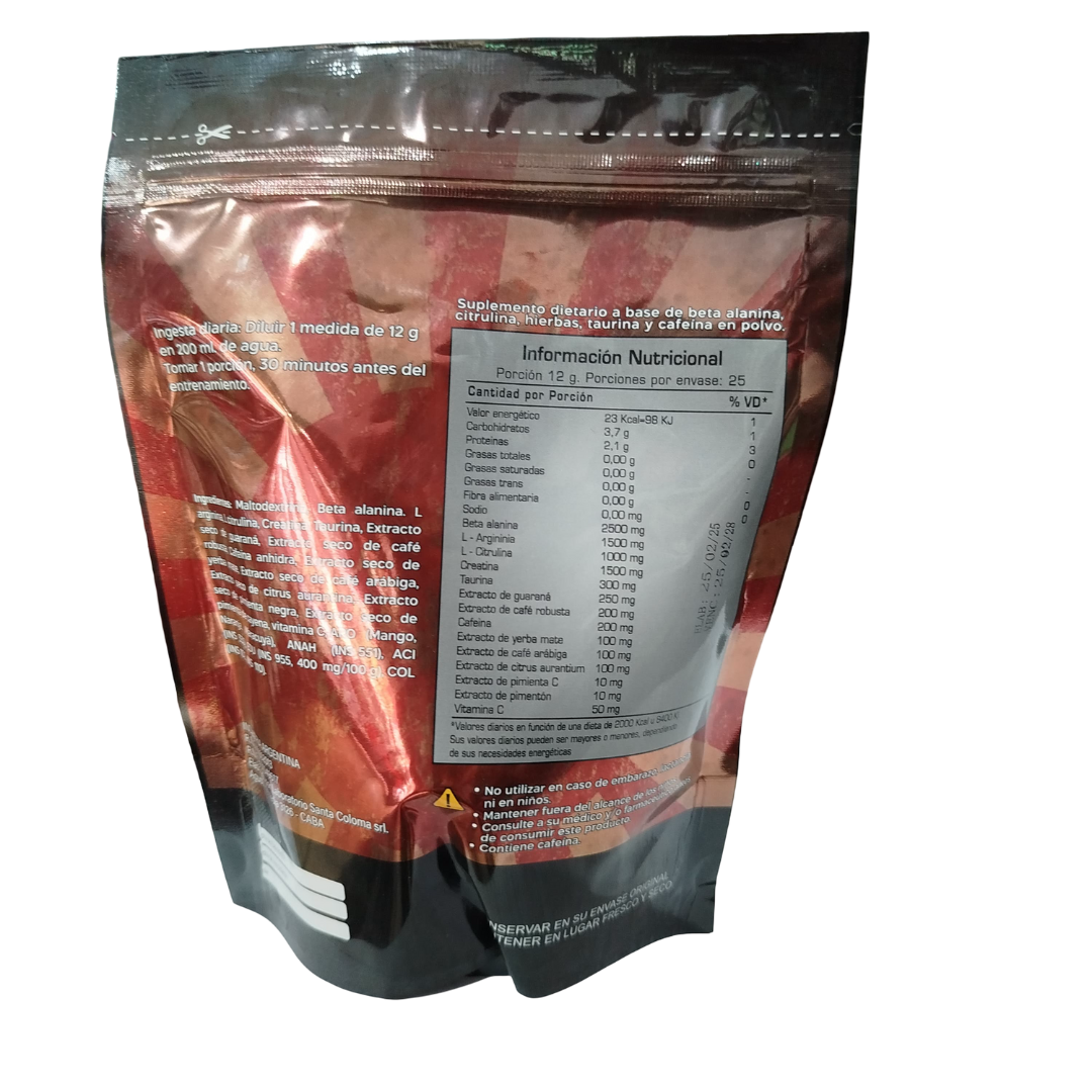 Diluir una medida de 12 gr en 200 ml de agua. Tomar una porción 30 minutos antes del entrenamiento.