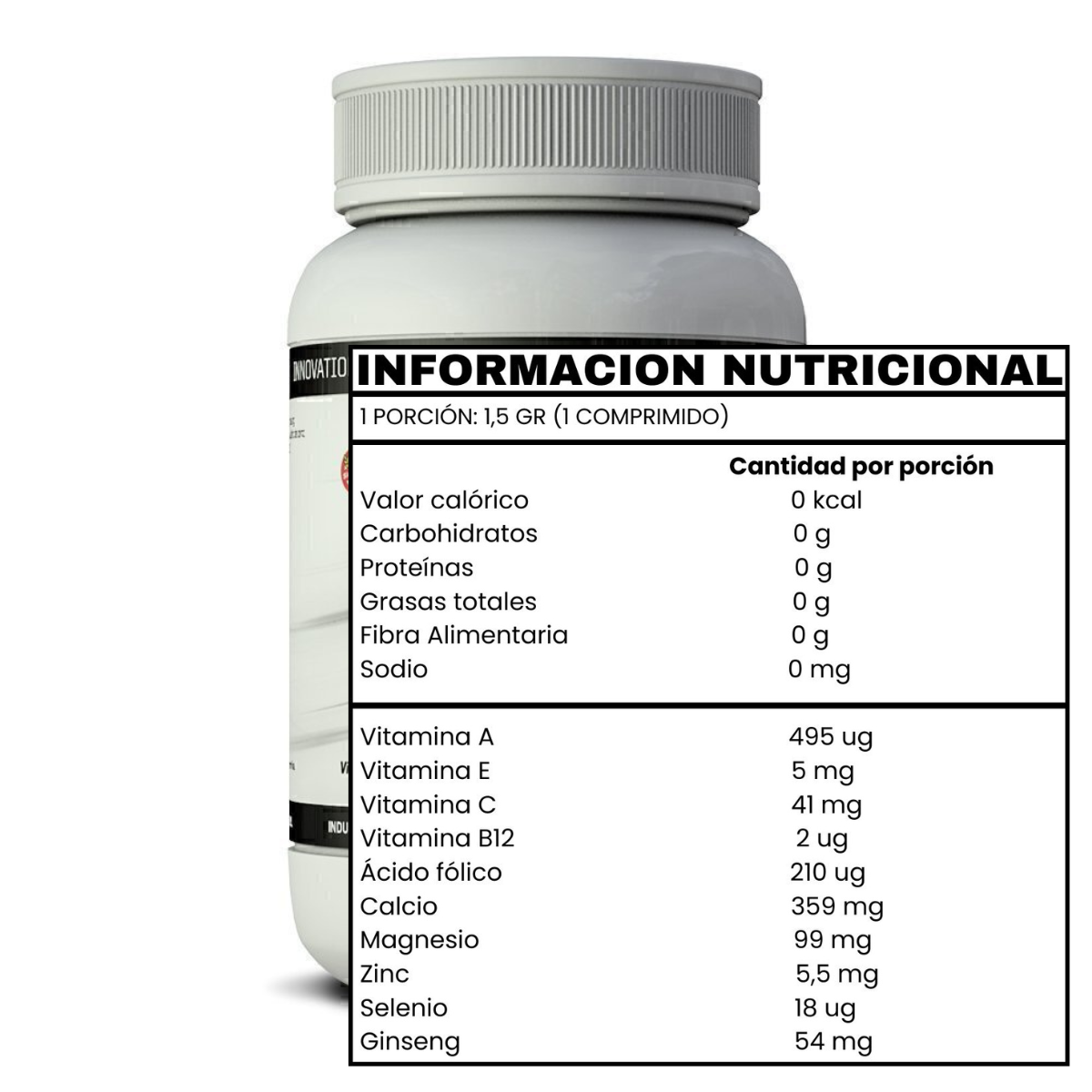 Suplemento dietario a base de vitaminas, minerales y ginseng. Libre de gluten (sin tacc).