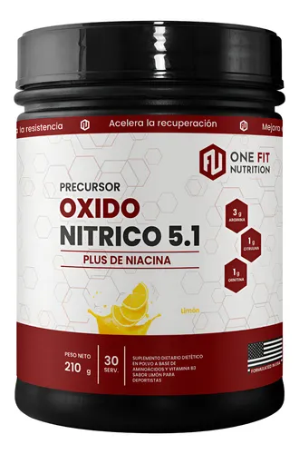 Óxido Nítrico 5.1 210 gramos – 30 servicios | One Fit Descubrí el poder del precursor de óxido nítrico formulado especialmente para potenciar tu rendimiento y recuperación muscular. Este suplemento a base de arginina, citrulina, niacina y ornitina está diseñado para deportistas y personas activas que buscan llevar su entrenamiento al siguiente nivel. Beneficios clave del Óxido Nítrico 5.1 Mejora la circulación sanguínea: La arginina y la citrulina estimulan la producción de óxido nítrico en el cuerpo, favoreciendo la vasodilatación y aumentando el flujo sanguíneo hacia los músculos. Esto se traduce en una mejor oxigenación y nutrición muscular durante la actividad física. Aumenta el rendimiento y la resistencia: Gracias a una mejor irrigación sanguínea, podrás entrenar con mayor intensidad y durar más tiempo, retrasando la fatiga muscular. Apoyo en la recuperación muscular: La ornitina y la niacina contribuyen a la regeneración y reparación de tejidos, ayudándote a recuperarte más rápido después del entrenamiento. Fórmula completa y equilibrada: Combina ingredientes clave para optimizar la síntesis de óxido nítrico y mejorar tu bienestar general. Presentación y uso Contenido: 210 gramos en polvo, que rinde para 30 servicios de 7 gramos cada uno. Ideal para mezclar con agua o tu bebida preferida antes del entrenamiento. Apto para acompañar cualquier plan de entrenamiento y nutrición deportiva. ¿Por qué elegir Óxido Nítrico 5.1 de One Fit? Este suplemento es una herramienta esencial para quienes buscan mejorar su rendimiento físico, aumentar masa muscular y optimizar la recuperación. Su fórmula cuidadosamente equilibrada con ingredientes de calidad garantiza resultados visibles y una experiencia segura.