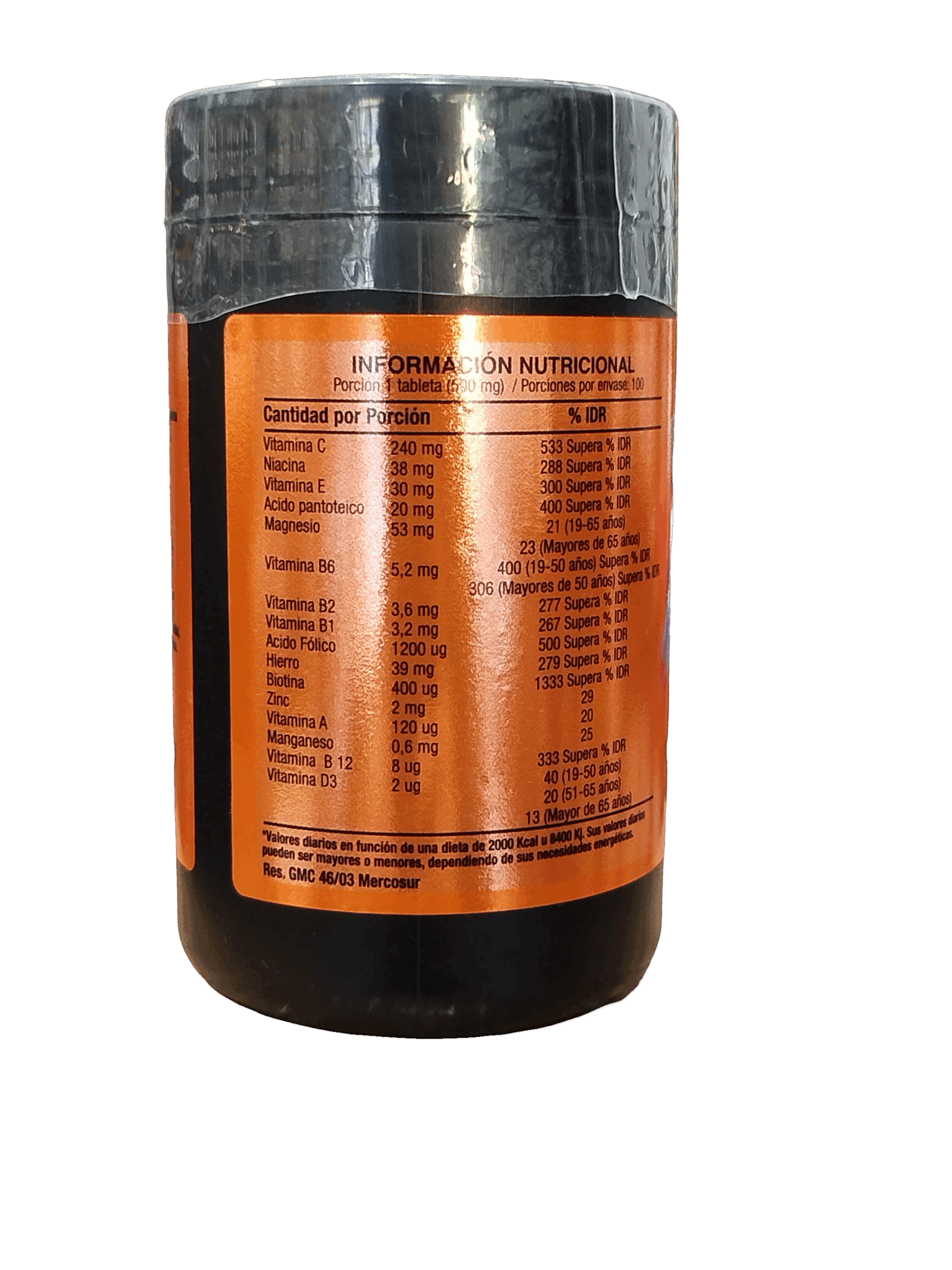 Vitamina C, Maltodextrina, Vitamina B3, Vitamina E ,Vitamina B5, Magnesio gluconato, Vitamina B6, Vitamina B2, Vitamina B1, Ácido Folico, Fumarato ferroso, Vitamina H, Gluconato de zinc, Vitamina A, Gluconato de manganeso,Vitamina B12 ,Vitamina D3, ANAH (INS 470).