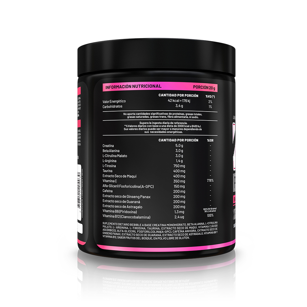 Su fórmula única incluye creatina, beta alanina y cafeína para energía explosiva, además de citrulina y arginina para maximizar el flujo sanguíneo. Con antioxidantes como el maqui y la vitamina C, y un refuerzo mental gracias a la tirosina.